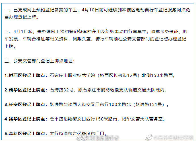 #石家庄身边事# 【提醒!#石家庄市区电动自行车集中登记上牌今天结束#】3月30日,从石家庄市公安局交通管理局了解到,石家庄市桥西区、新华区、长安区、裕华区、高新区电动自行车集中登记上牌攻坚行动将于3月31日24时结束,届时将关闭上述五区网上预约登记备案系统。现将有关事项提示如下↓↓↓来源|河青新闻网