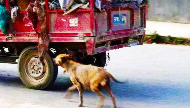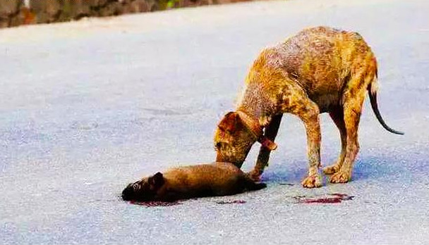 当狗妈妈回过神,并且发现自己小孩没有呼吸后,就像发疯了一样,朝着疾驰的三轮车追去,不停地发出撕心裂肺的吼叫,同时它那眼神死死锁定三轮车,仿佛想要把这辆将自己小孩压死的三轮车撕碎一样。