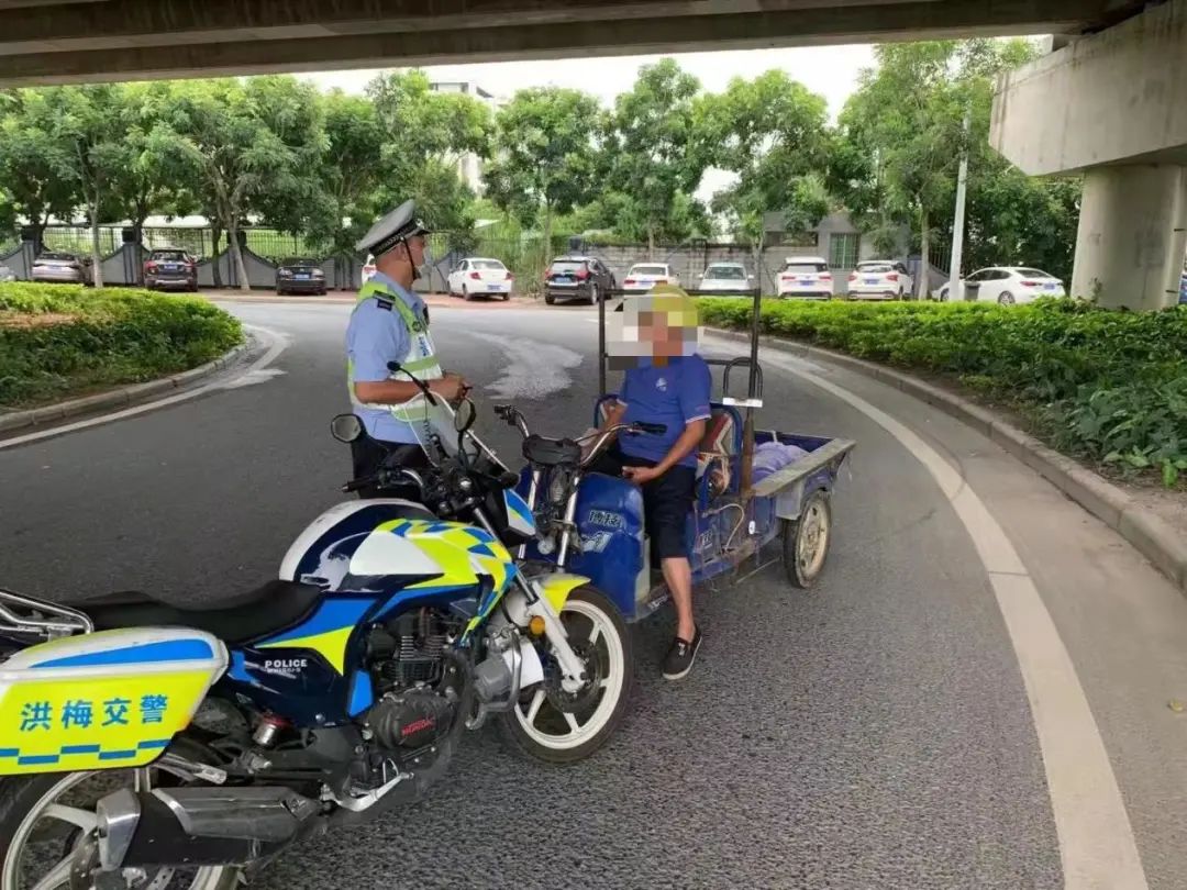 ↑↑在洪梅,执勤人员查处电动三轮车逆行交通违法