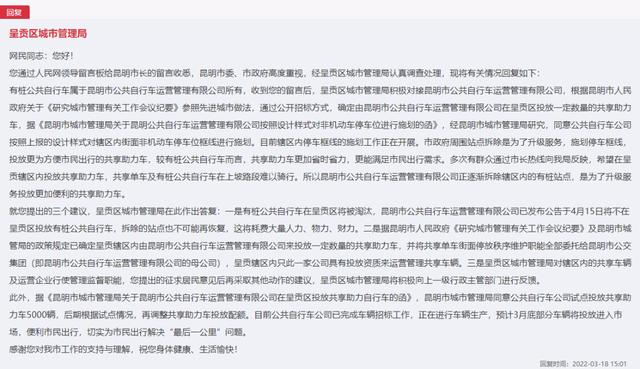 此外,市民还提问,如果不能正常使用昆明市公共自行车,是否能允许美团、哈啰、青桔三家共享单车在呈贡投放呢?对此,呈贡区城市管理局也回复:昆明市城管局的政策规定已经明确,呈贡辖区内由昆明市公共自行车运营管理有限公司来投放一定数量的共享助力车,并将共享单车街面停放秩序维护职能全部委托给昆明市公交集团,呈贡辖区内只此一家公司具有投放资质来运营管理共享单车。