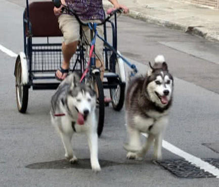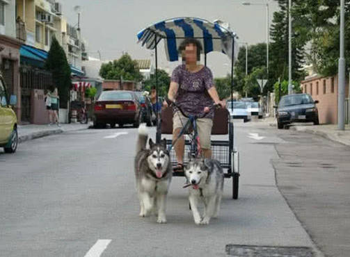 让媳妇带出去吧,它们又跑的太猛,媳妇看不住,无奈之下网友想到一个办法。弄一张三轮自行车,然后将二哈拴在自行车的龙头,让自家媳妇骑着三轮车出去遛狗。安全上,三轮车驾驶稳定性高,也不必担心二哈跑快了给媳妇带来危险。