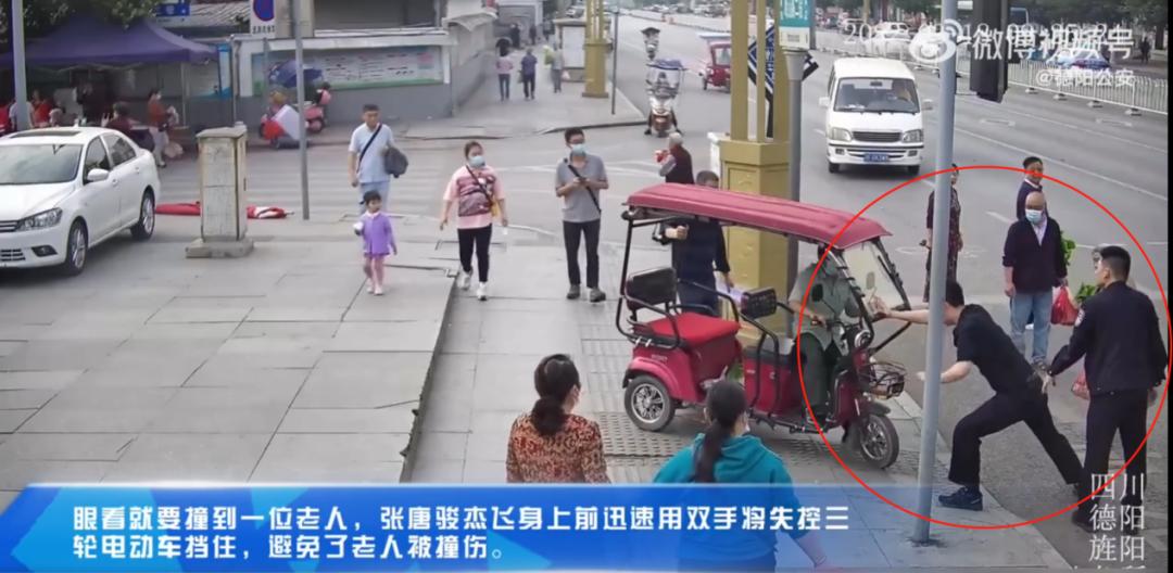 近日,四川德阳八角井派出所民警张唐骏杰和游浩外出办案时,发现一辆失控的三轮电动车正从人行道往人群里面冲过来,眼看就要撞到一位老人,张唐骏杰飞身上前迅速用双手将失控三轮电动车挡住。(@人民网、@平安德阳经开区)
