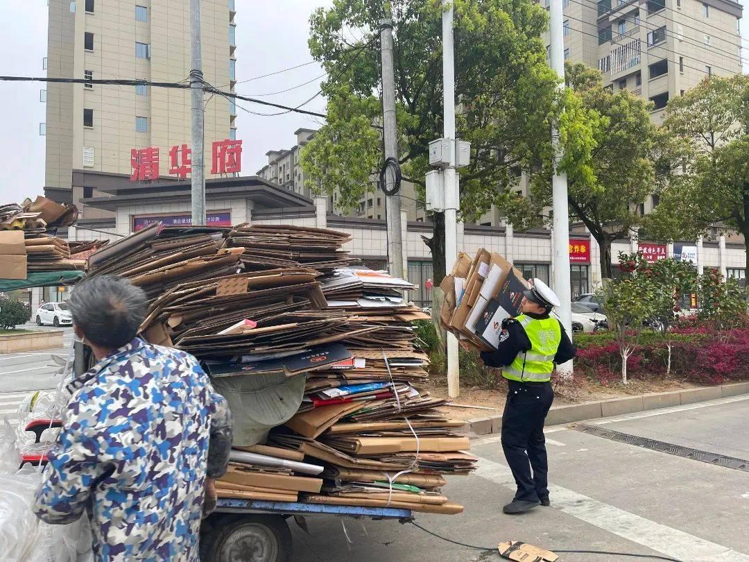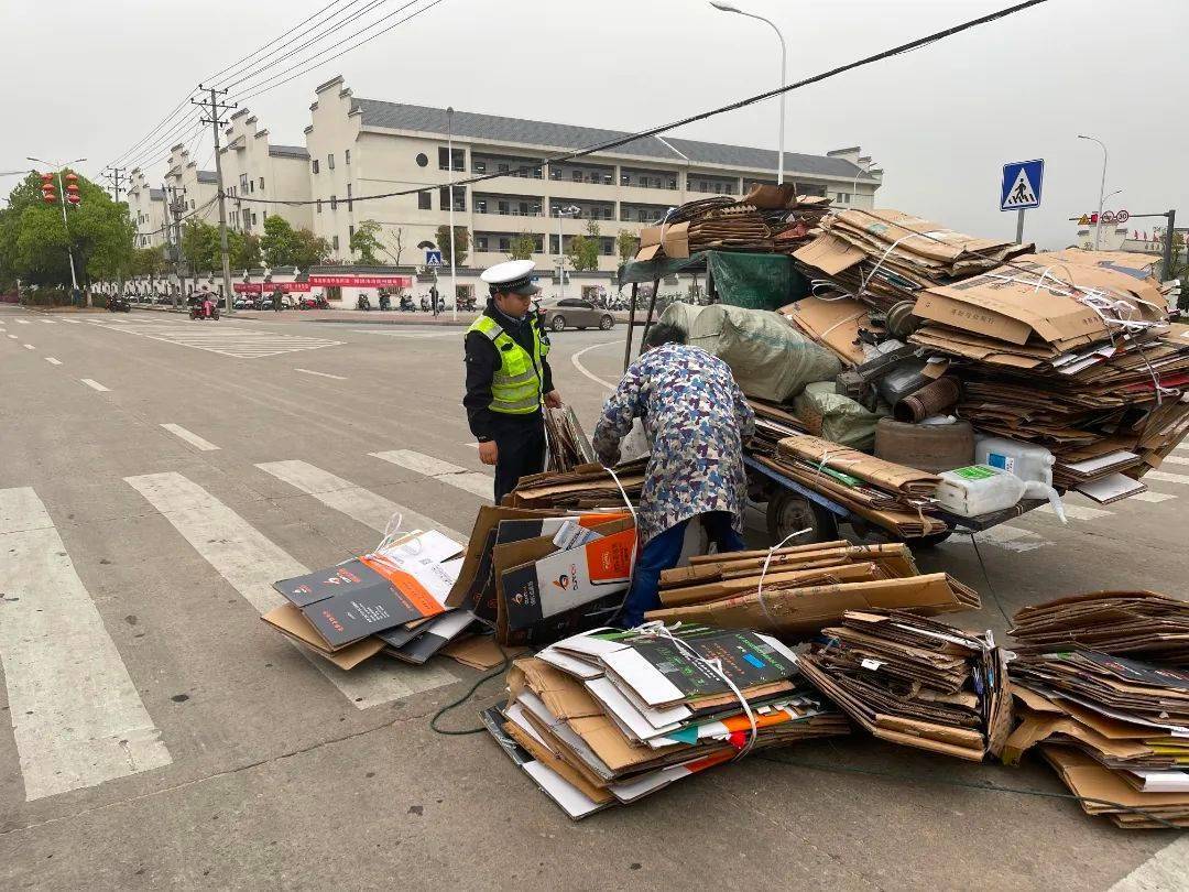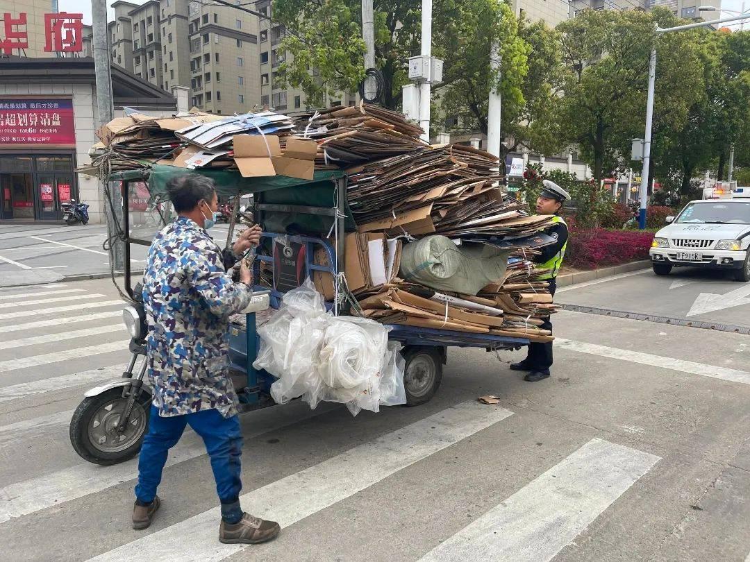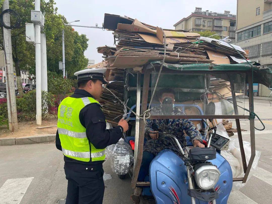 3月21日下午,南城县公安局交警大队执勤民警在泰伯路段巡逻时,发现一男子驾驶三轮车因车上的货物没有固定好,在途中滑落下来,给过往车辆带来了交通安全隐患。