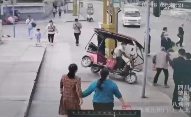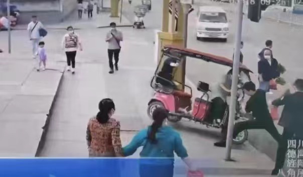 近日,四川德阳一则三轮车失控,警察徒手挡住的视频在网上走红。视频中,一辆三轮车从马路旁边的人行道缓缓驶出,这条道路上的行人不少,三轮车的正前方还有一些行人在等着过马路。在三轮车下一个台阶时,突然加速失控,径直地撞向了前面正在等着过马路的一个老人。老人也发现了三轮车向自己撞过来,但是老人也根本来不及反应和躲闪,只能用手试图去拦一下。旁边的一位警察当即一个弓步,双手抵住三轮车,将快要侧翻的三轮车往后推并且将其扶正。同时,后面也有一位过路的群众拉了一把三轮车后面的杆。司机也赶忙下车,在感受到三轮车没有再失控之后,警察也慢慢地松开了手。