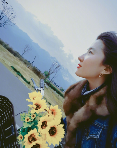 不仅有和油菜花的合影拍照,还有刘亦菲在乡间的道路上骑着自行车飞驰。有趣的是,在刘亦菲的自行车上还有几朵向日葵,刘亦菲则拍了自己的侧脸照。看见刘亦菲皮肤一如既往白里透红,脸色露着微笑,看得出来,心情极好。